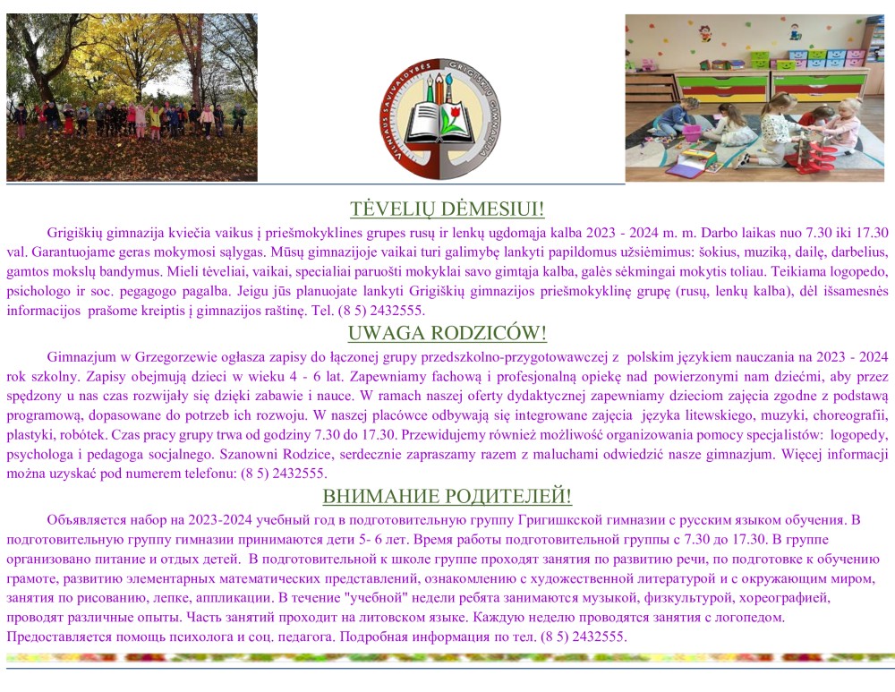 Grigiškių gimnazija kviečia vaikus į priešmokyklines grupes rusų ir lenkų ugdomąja kalba 2023 – 2024 m. m.
